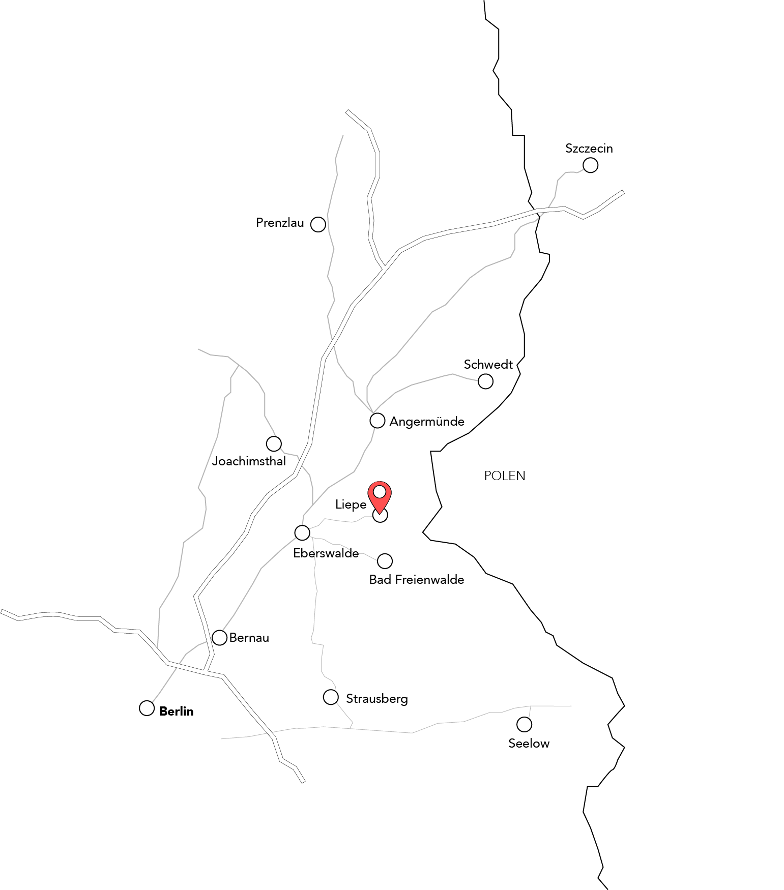 Von Berlin aus fährt man über die A11 Richtung Stettin, nimmt die Abfahrt Finowfurt, folgt der B167 Richtung Eberswalde/Niederfinow und fährt ab Niederfinow weiter nach Liepe. Die Anfahrt erfolgt überwiegend über gut ausgebaute Landstraßen.