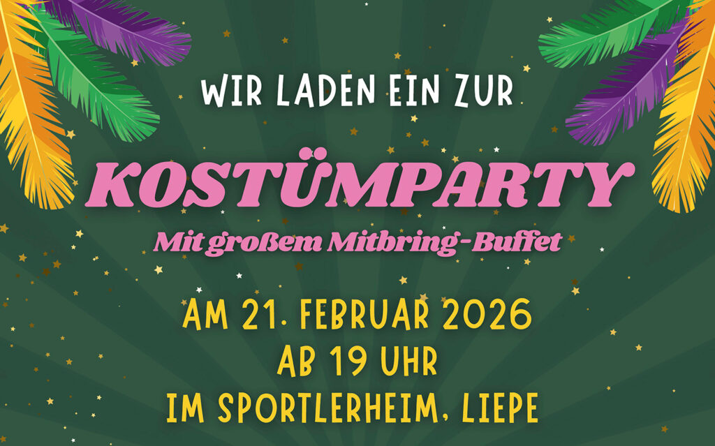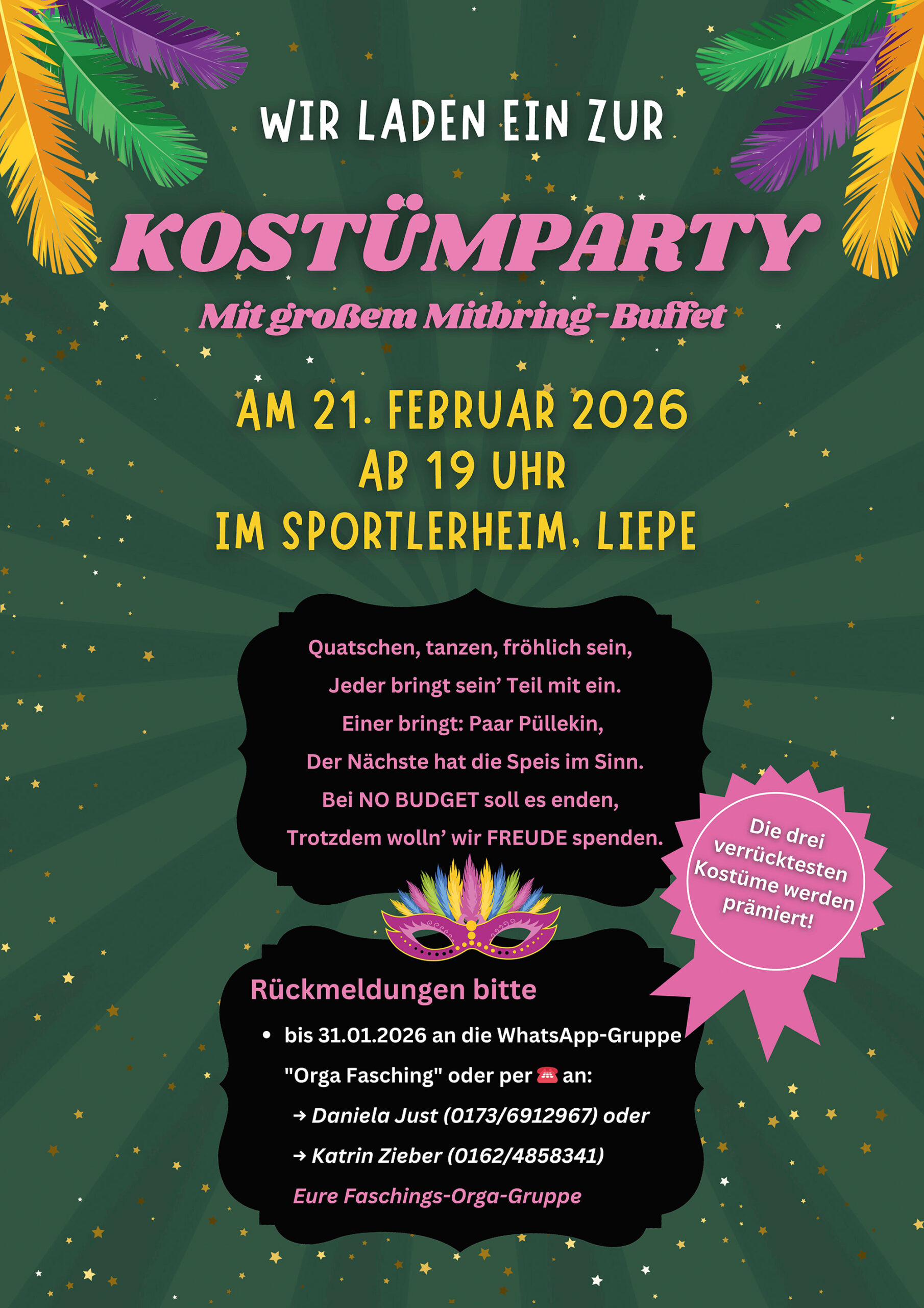 Am 21. Februar 2026 feiern wir ab 19 Uhr eine bunte Kostümparty im Sportlerheim Liepe.