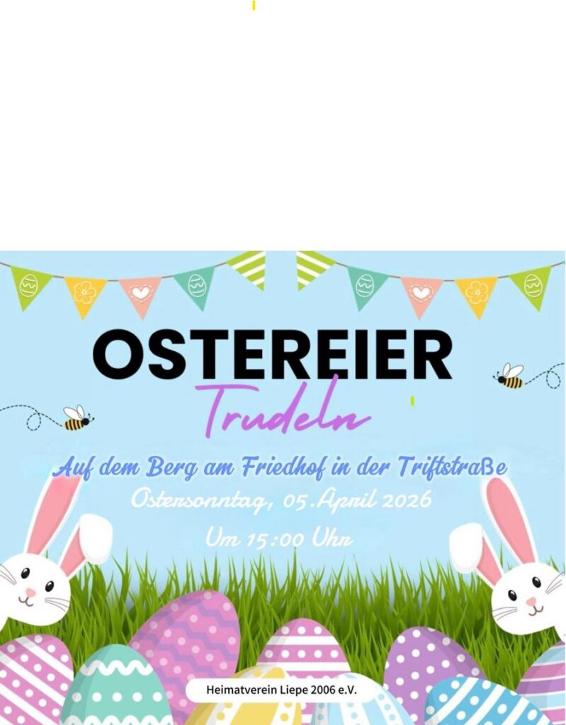 Der Heimatverein Liepe 2006 e.V. lädt am Ostersonntag ab 15 Uhr zum gemeinsamen Ostereiertrudeln ein. Treffpunkt ist der Berg am Friedhof in der Triftstraße.